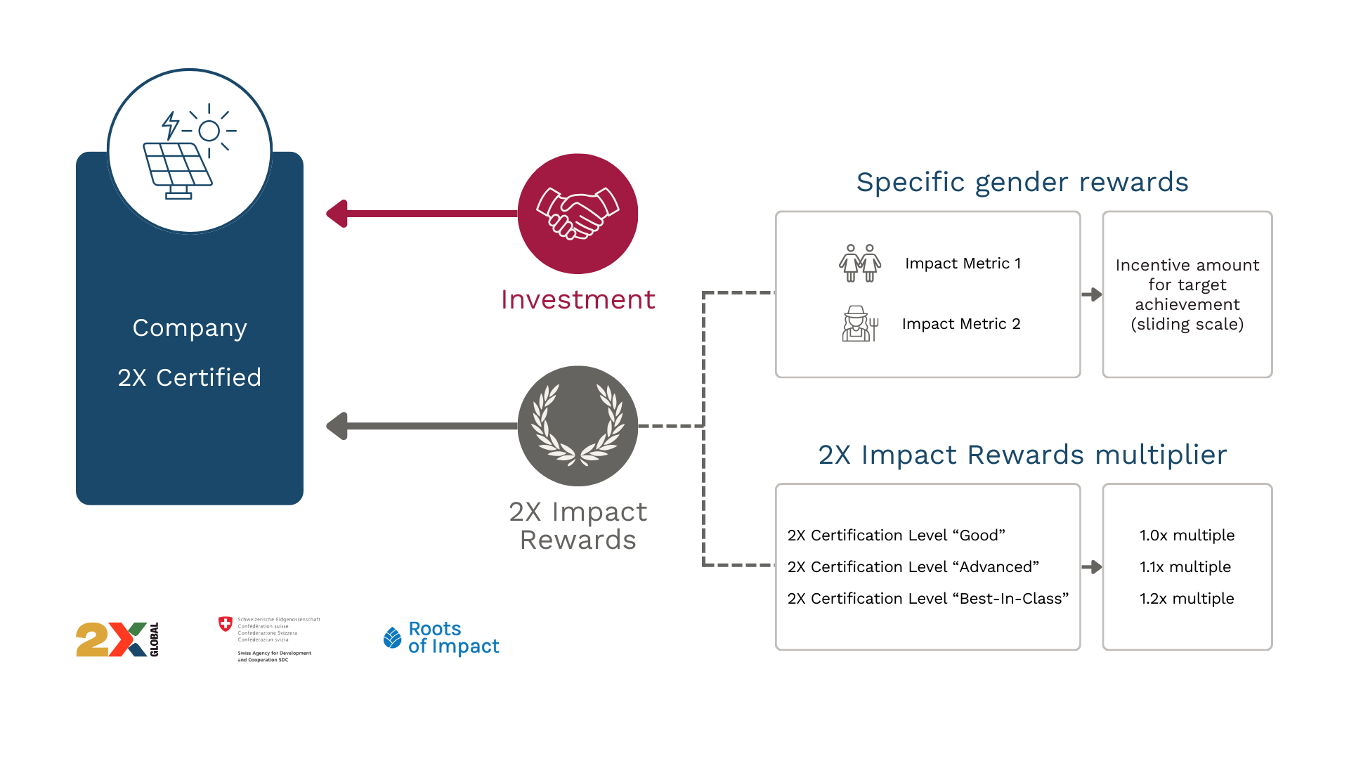 2X Global, Roots of Impact and the Swiss Agency for Development and Cooperation (SDC) are partnering to introduce 2X Impact Rewards – a model investors can use for rewarding companies that have obtained 2X Certification with financial incentives for achieving improved gender outcomes.